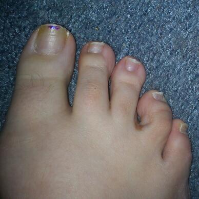 Took this photo of my right foot to show the damage in my forth toe. Since this was taken, I have lost all range of motion in the three inner toes upper joint. The purple on my big toe is left over fingernail polish.